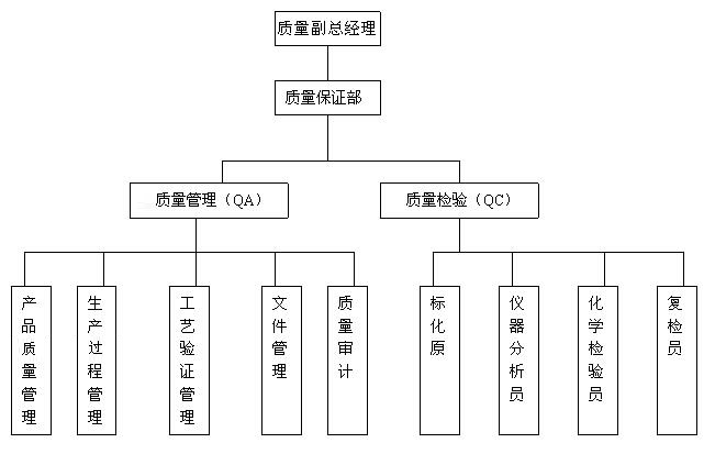 公司质保部独立于生产部门,直接受公司负责人领导,以GMP的管理理念负责生产的全过程的质量管理和检验工作。质保部下设质量管理人员(QA)和质量检验人员(QC),质量体系架构图如下:
